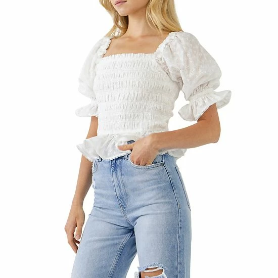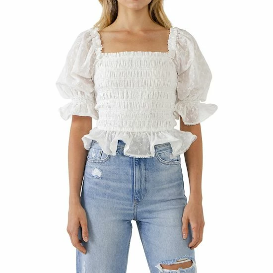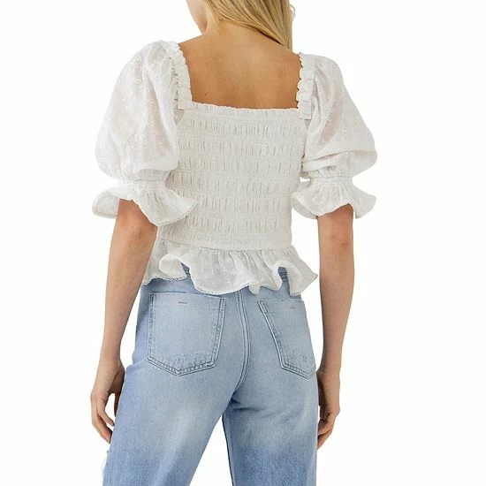 This beautiful embroidered lace top is perfect for a special event or a fun night out. The smocked bodice and cinched puff sleeves flatter your figure while the ruffle peplum adds a touch of fun and flair.