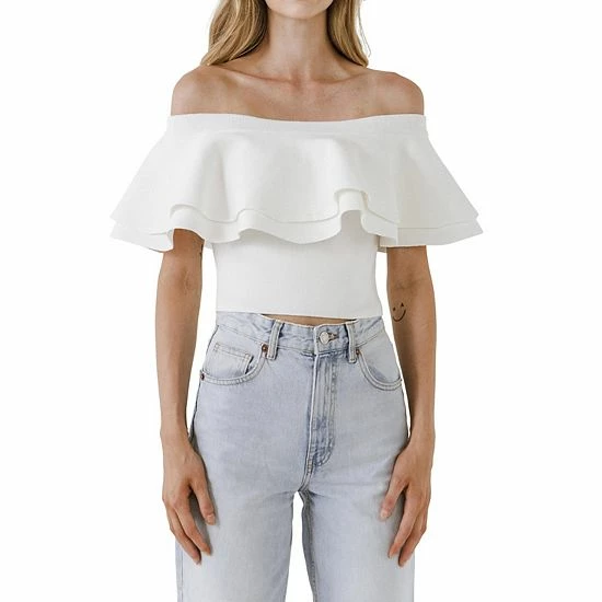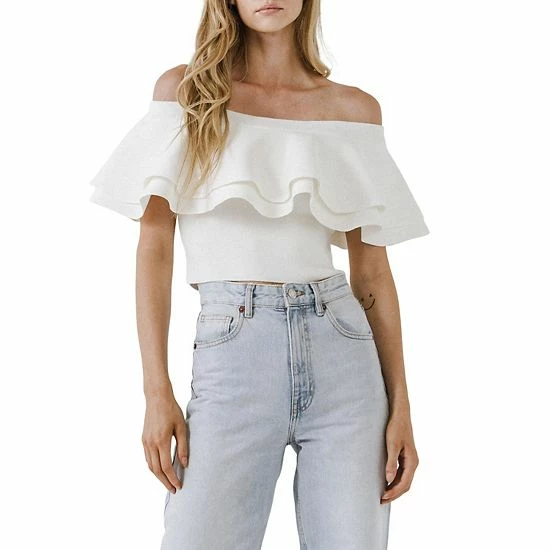 The perfect top for any occasion. This off-the-shoulder crop knit top is so comfortable and perfect for any occasion. The tiered ruffle sleeves are so feminine and easy to wear. This crop top features a long, relaxed silhouette that will pair perfectly with your favorite jeans