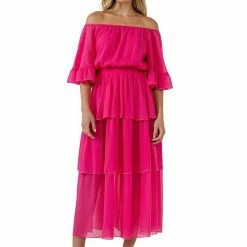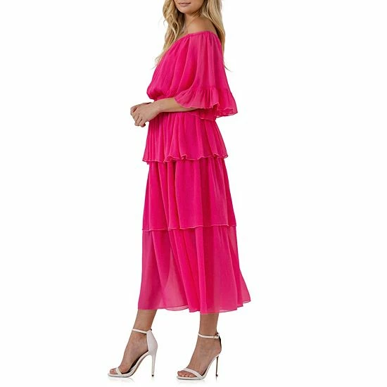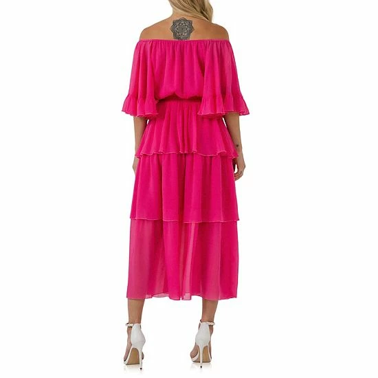 For a touch of elegance this maxi will be your go-to. With an off the shoulder neckline and ruffled tier design this maxi is perfect for any special occasion. Made with sheer chiffon fabric and lined with soft fabric it’s also comfortable to wear. With an elastic waistband it’s easy to put on and take off.