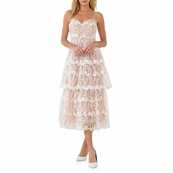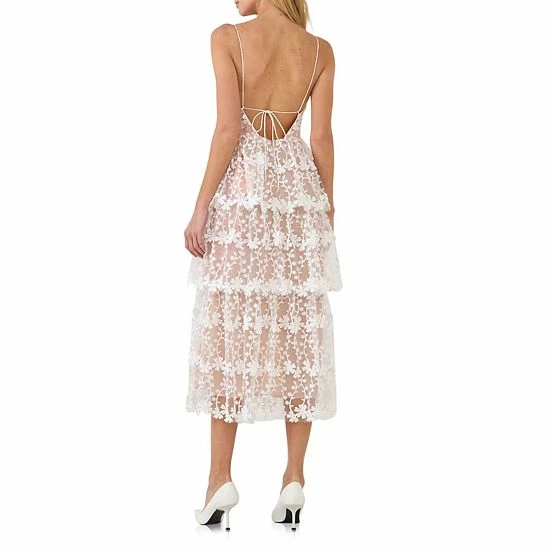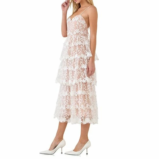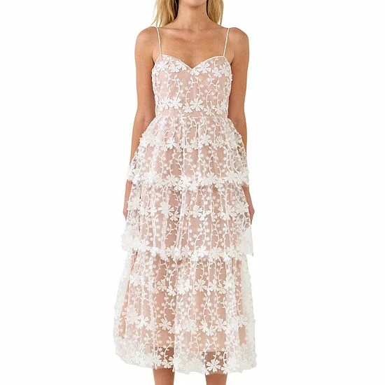 Add a touch of sweetness to your style with this crochet midi dress. This delicate dress features sheer lace fabric with a matching lining. The thin spaghetti straps and back tie detail add a touch of elegance, while the tiered skirt gives it a playful touch. Perfect for any special occasion, this pretty crochet midi dress is sure to turn heads.