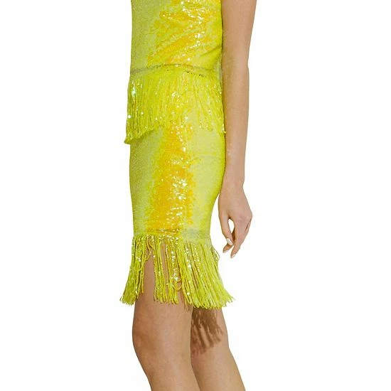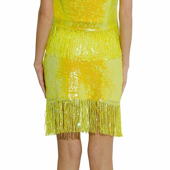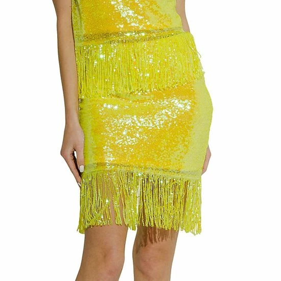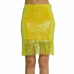 Woo everyone in this sparkly sequin skirt. The fringe hem adds a touch of fun and flirty to this otherwise simple skirt. The elastic waistband provides a comfortable and figure-flattering fit. Whether you’re going out for a festive party or just want to add some pizzazz to your everyday outfit, this skirt is sure to do the trick.