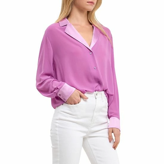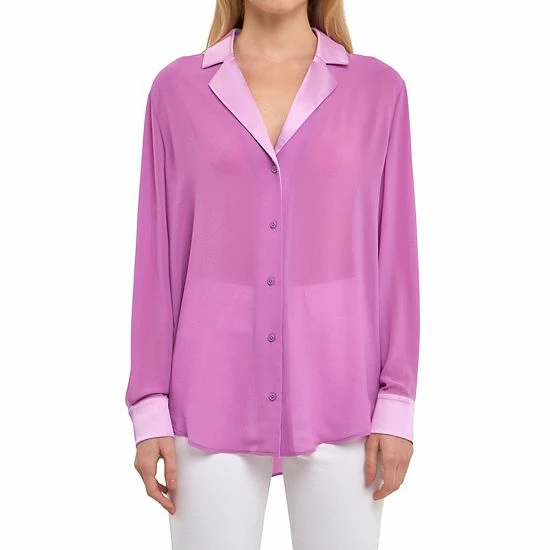 Spruce up your work wardrobe with this satin chiffon dress shirt. The loose fit and front buttons give you a stylish and comfortable look while the contrast fabric collar and cuffs add a touch of sophistication. Pair this shirt with slacks and heels for a professional ensemble or dress it down with jeans and flats for a more casual look.